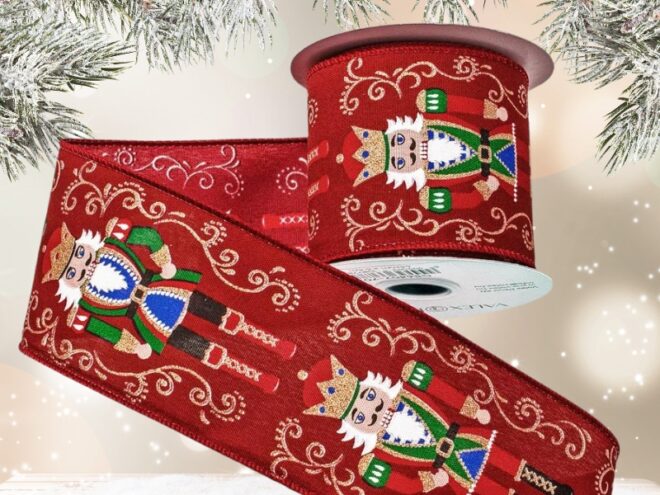 Diótörős karácsonyi szalag piros színben 64mm, drótos szegéllyel