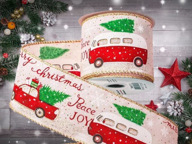 Fenyőfás-autós karácsonyi szalag 64mm, drótos szegéllyel