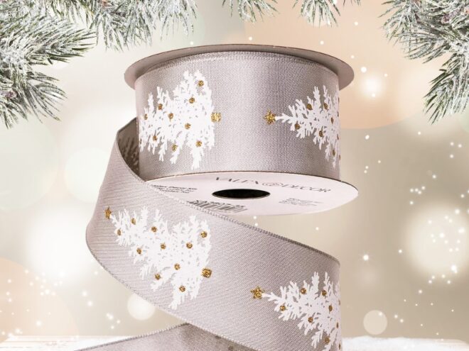 Fenyőfás karácsonyi szalag ezüst színben 38mm, drótos szegéllyel