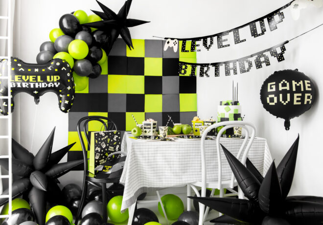 Ünnepeld a legnagyobb gamer születésnapját stílusosan a Gamer szülinap dekoráció szettünkkel! Ez a szett minden szükséges kelléket tartalmaz, hogy a buli igazán emlékezetessé váljon. Dekorálj a gamer témájú lufikkal, zászlókkal és asztalterítővel, és teremts egy valódi játékos hangulatot.