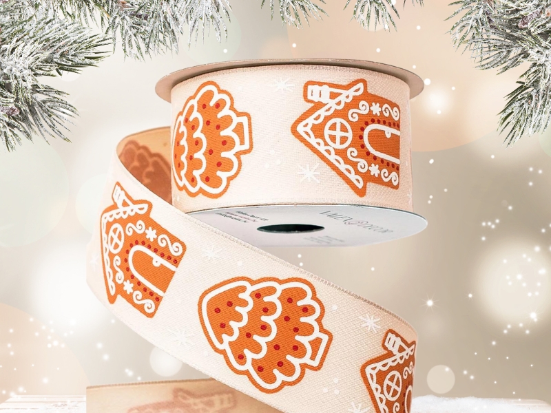 Mézeskalács házikós karácsonyi szalag krém színben 38mm, drótos szegéllyel